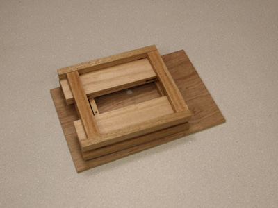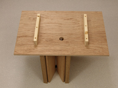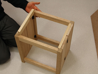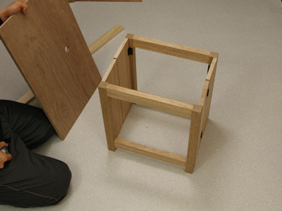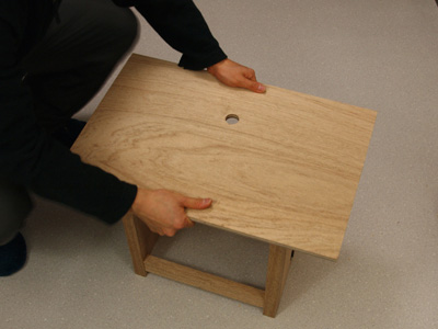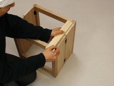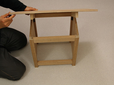 胴体部分は兆番がついているのでそのままだとぐらぐらしてつかいものになりませんが、この天板に棒をつけると胴体部分内側にうまく突っ張って蝶番が動かなくなる仕組みです。 |